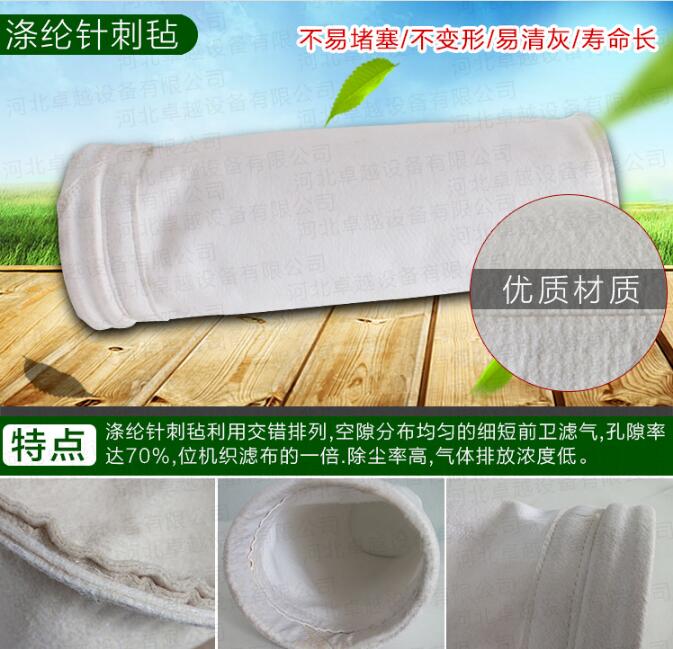 抗水防油滌綸針刺氈除塵布袋是針刺尼利用疏水劑和疏油劑經(jīng)浸軋,預(yù)烘,焙烘處理而形成的.疏水劑和疏油劑經(jīng)迅速烘干后,以圓狀包附于濾料纖維的表面,從而減少了水和油與濾袋的表面張力,這樣水,油和粉塵形成的濕性過濾介質(zhì)_不會(huì)粘附于濾袋的表面,從而避免了糊袋現(xiàn)象.拒水防油針刺尼通常是在除塵器箱體溫度低于露點(diǎn)溫度,含塵氣體的濕度又較大的情況下使用.